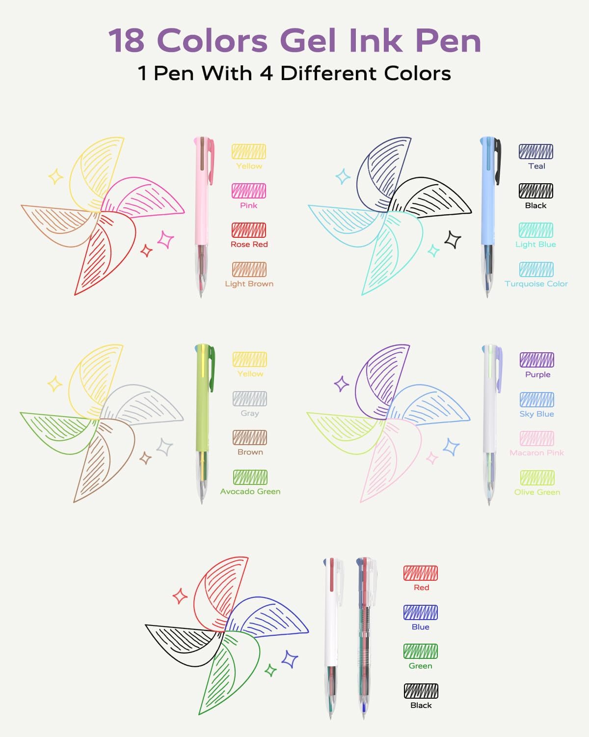 These colored pens features 18 different ink colors: black, blue, red, green, purple, macaron pink, sky blue, olive green, avocado green, brown, gray, yellow, pink, light brown, rose red, teal, turquoise, and light blue
