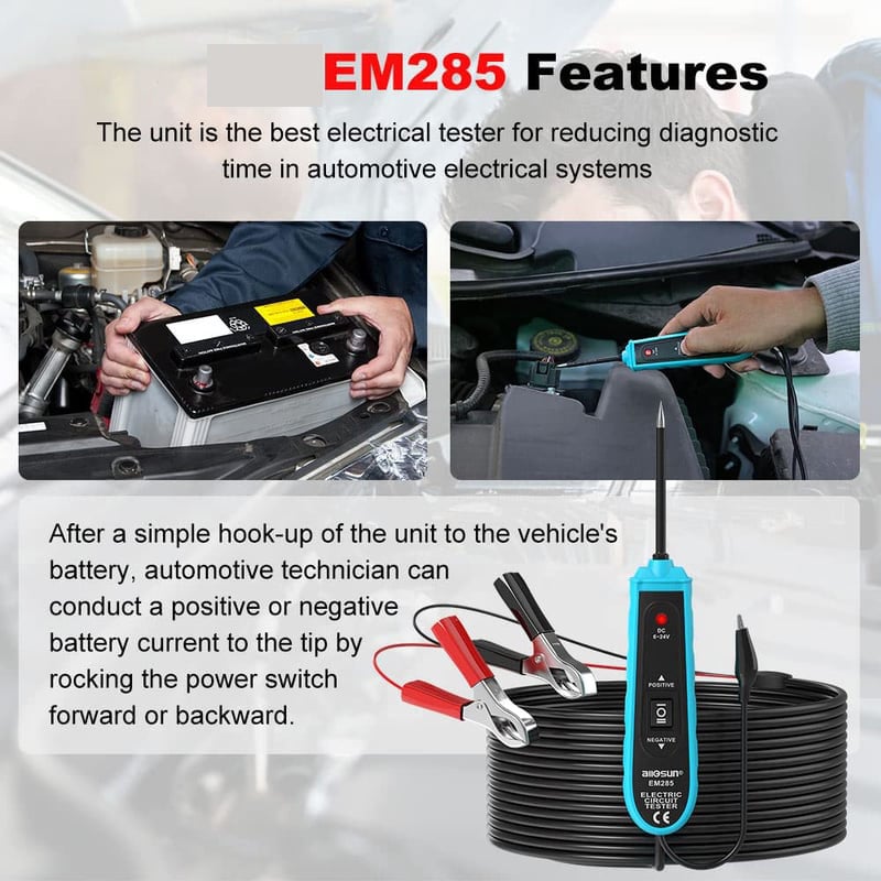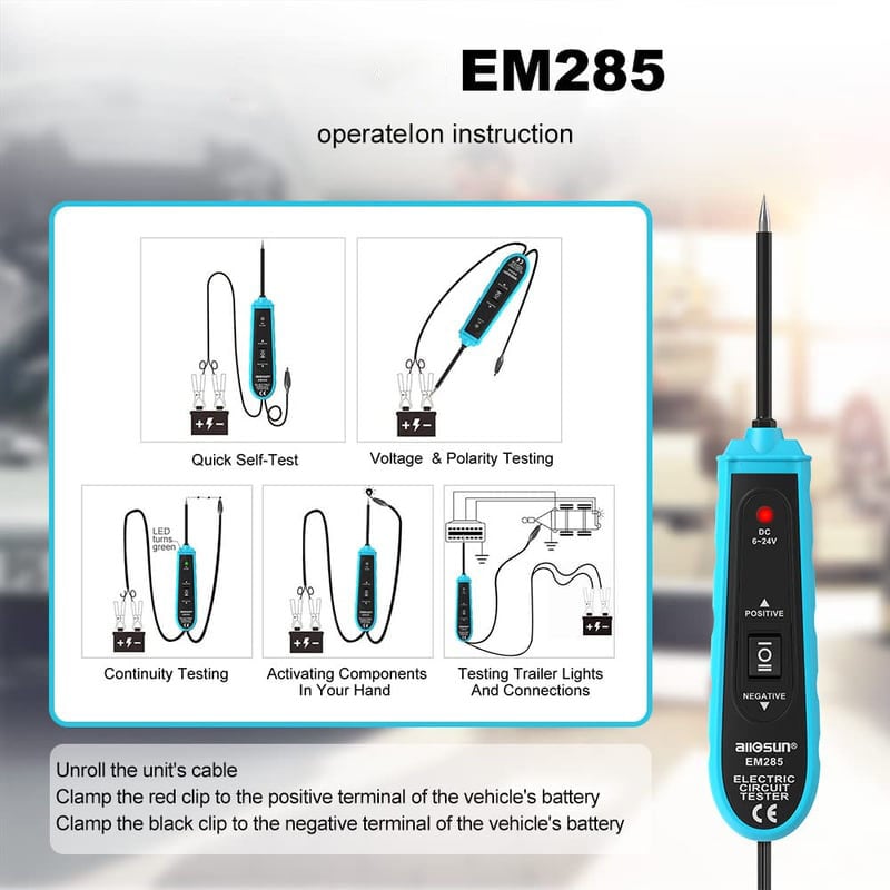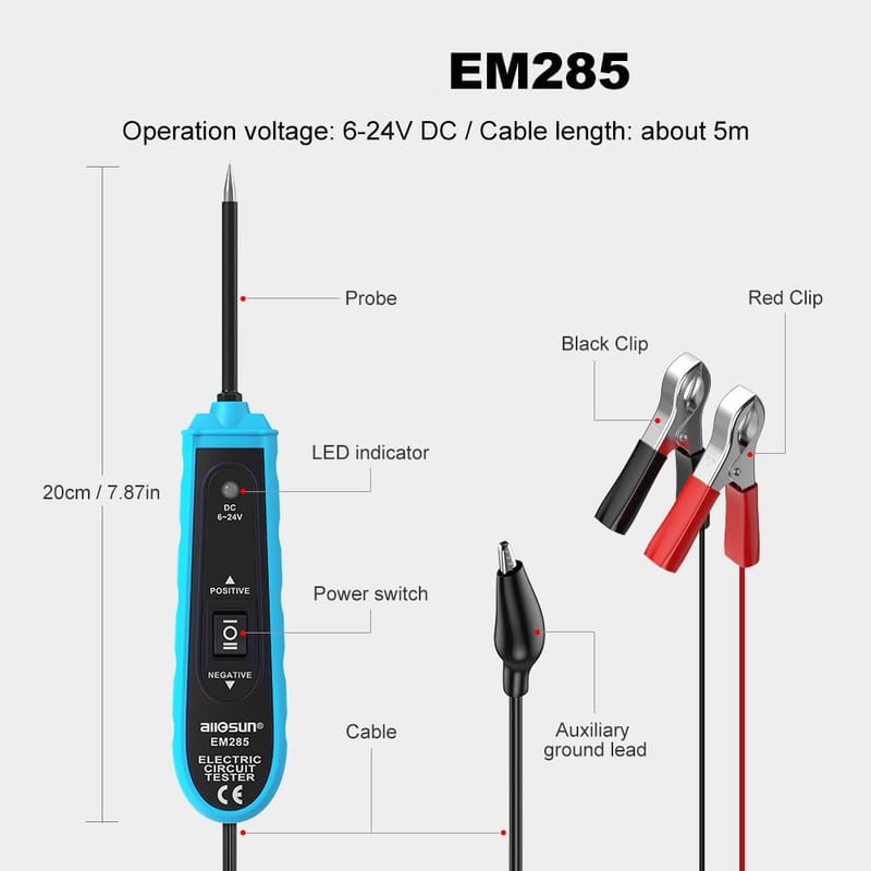 EM285 probe tester is an Electrical Tester for Reducing Diagnostic Time in Automotive Electrical Systems. The car circuit tester has short-circuit protection and can test for bad ground contacts instantly.