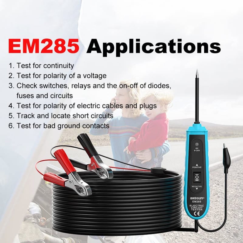EM285 car circuit tester tool cable length is about 16ft Makes Your Testing Easily. EM285 Automotive electric system 6-24V DC tools is a Comprehensive test kit. After a simple hook-up of the unit to the vehicle's battery, automotive technician can conduct a positive or negative battery current to the tip by rocking the power switch forward or backward.