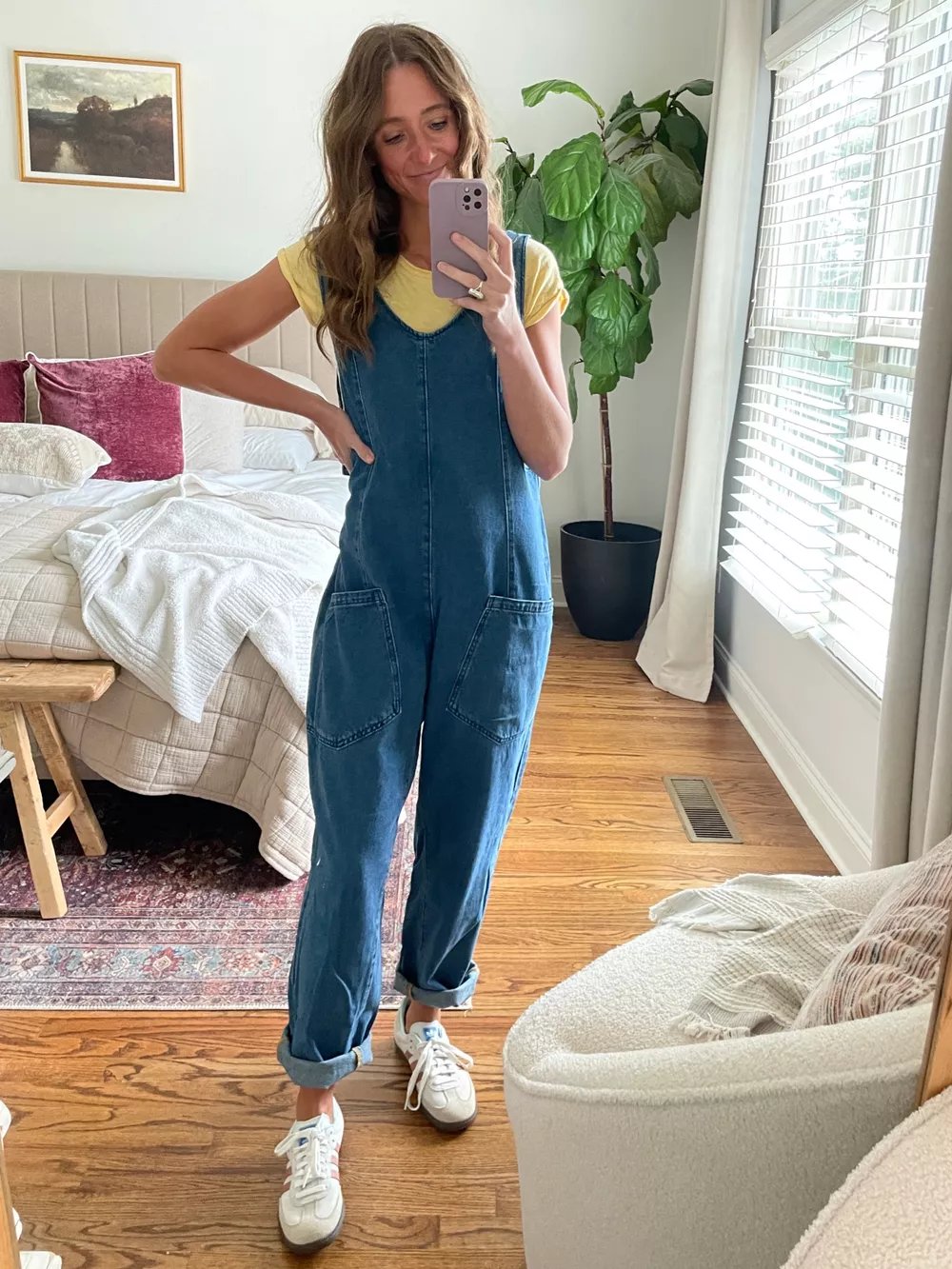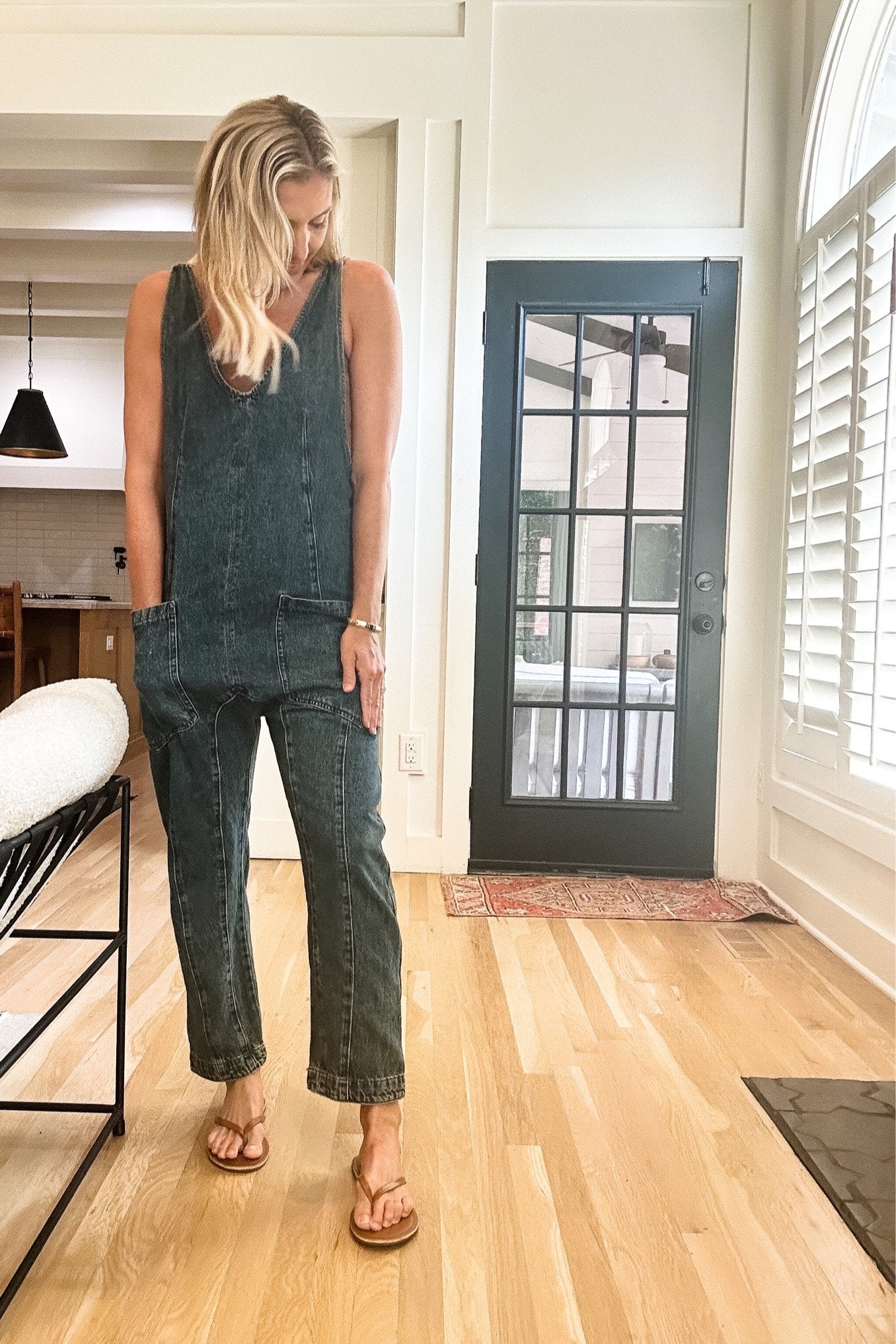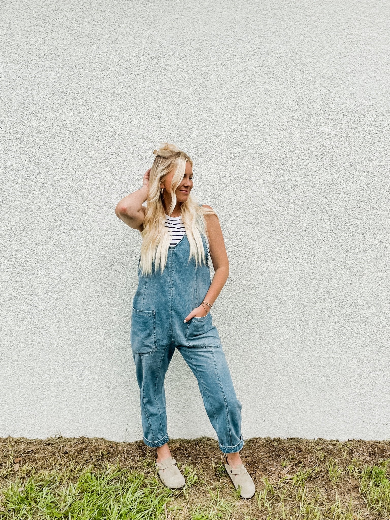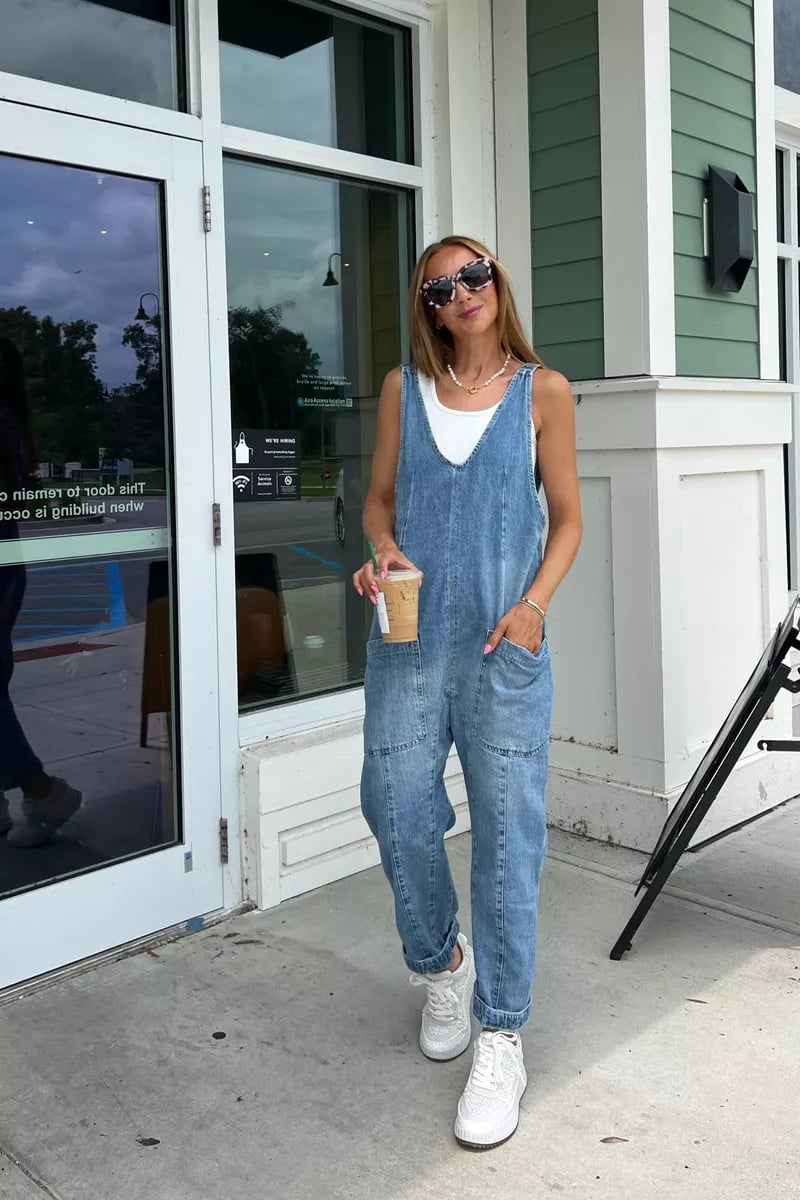 With a relaxed fit and a low scoop neckline, this denim jumpsuit will have you strutting in style. Plus, the harem-style legs and oversized patch pockets make it the perfect effortlessly chic outfit! Rock on!