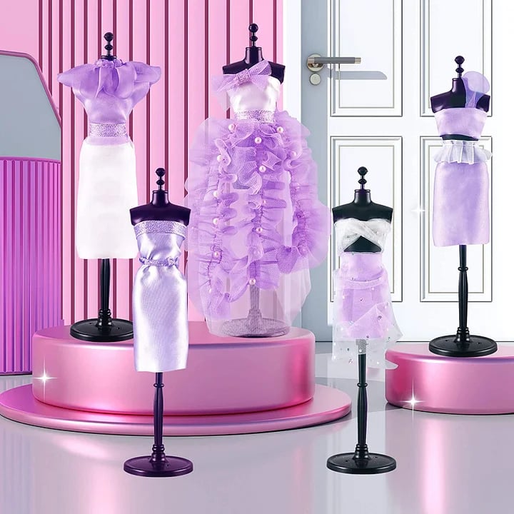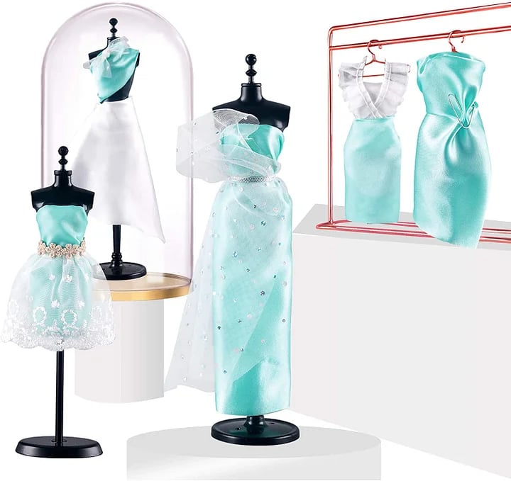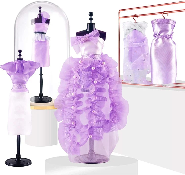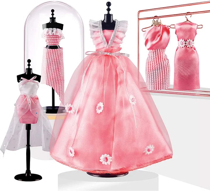 Learn the basics of fashion design and create your fascinating outfits. Draw and sketch several dresses or blouses in the sketchbook, cut the fabric and wrap it around a mannequin, coordinate fabrics with trim and flowers, and add rhinestones to embellish your designs. Perfect arts and crafts kits for kids and girls.