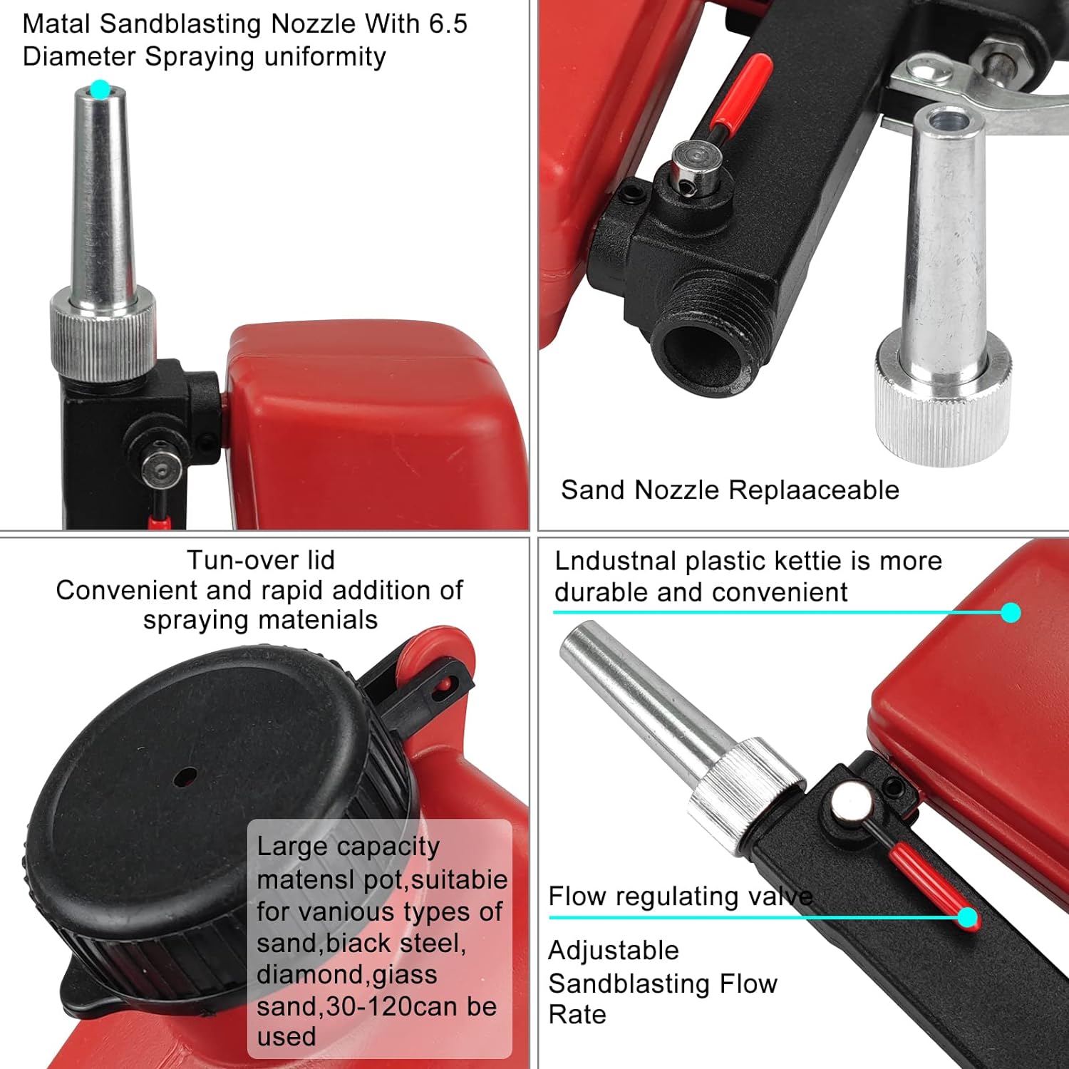 🔧Enhanced Design: anti-slip handle, comfortable grip, aluminum alloy trigger, high-hardness steel valve core, easy to operate.Suitable for all kinds of sand: glass beads, river sand, emery, quartz sand and other sands.